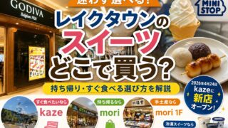 買い物情報 レイクタウンのスイーツはどこで買う?持ち帰り・食べ歩きおすすめを解説 レイクタウンのスイーツはどこで買うのが正解?kaze・mori別に、すぐ食べる・持ち帰りのおすすめと失敗しない選び方を実体験ベースで解説します。 2026.04.30 買い物情報